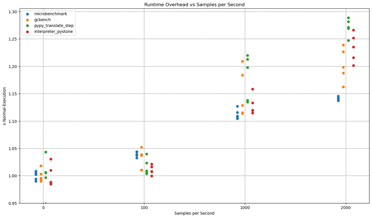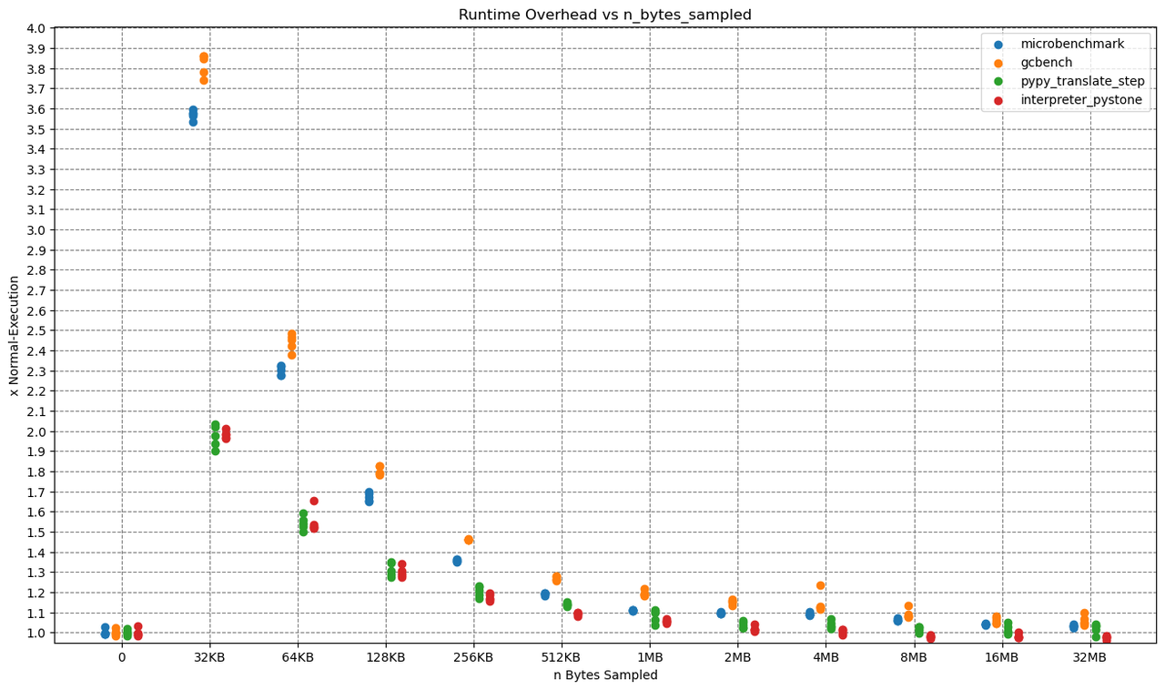 Another difference to time-based sampling is that the profiling overhead does not solely depend on the sampling rate (if we exclude a potential stack-depth - overhead correlation for now) but also on the amount of memory the user code allocates.